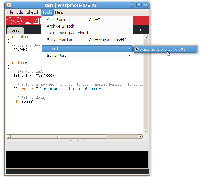 Tools > Board 탭에서 Waspmote 보드를 선택해야합니다. 선택한 API를 나타냅니다.