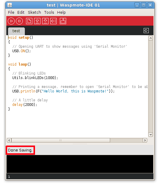 이 두 매개 변수가 구성되면 Waspmote에 프로그램을로드 할 수 있습니다. 이 과정은 아주 간단한 예를 사용하여 설명합니다. Waspmote 환경을 배우고 익히기위한 일련의 예제가 컴파일러가 포함 된 다운로드 파일에 포함되어 있습니다.