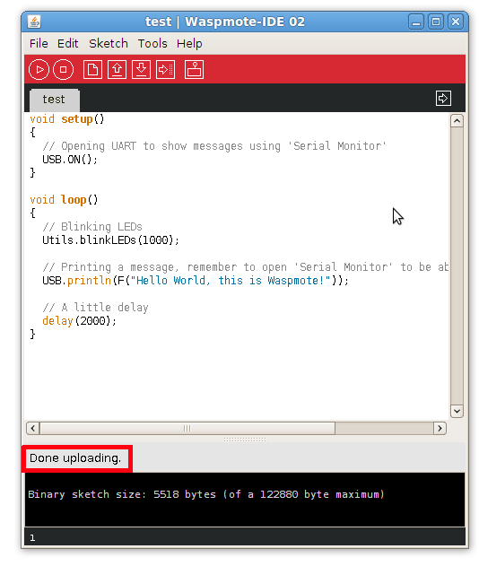 프로그램이 올바르게로드되면 Waspmote 창에 'Done Uploading'이라는 메시지가 나타납니다.