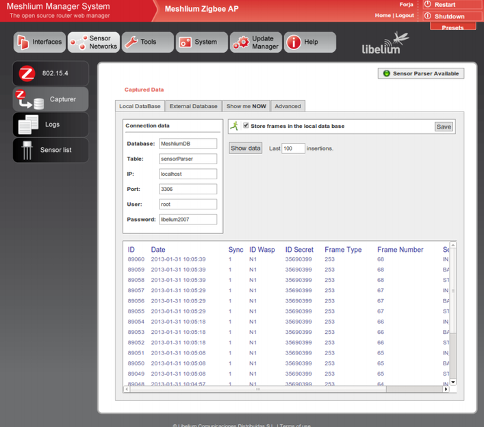 Meshlium은 무선 모듈을 사용하여 Waspmote가 전송 한 센서 데이터를 수신하고 프레임을 로컬 데이터베이스에 저장합니다. 이는 Sensor Parser 덕분에 자동으로 수행 할 수 있습니다.