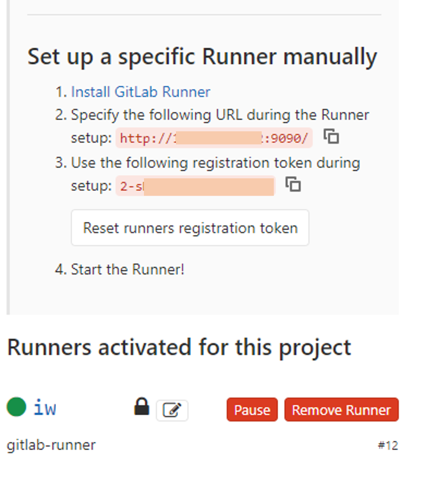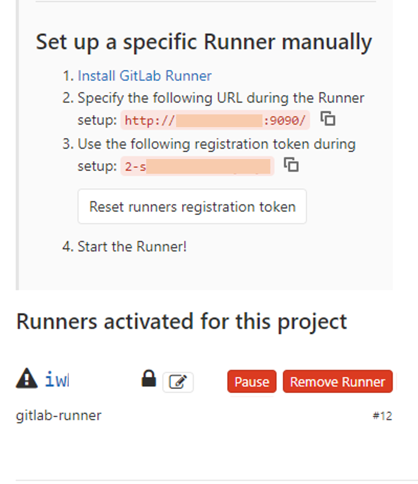 Specific Runners 의 3번 항목이 Sample Project 의 token 을 복사 해줍니다. 이 토큰은 Gitlab runner 설치 및 설정시 사용됩니다.