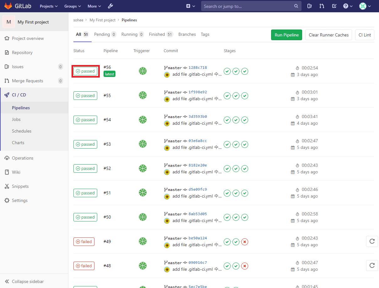 CI/CD > Pipelines 확인 하기