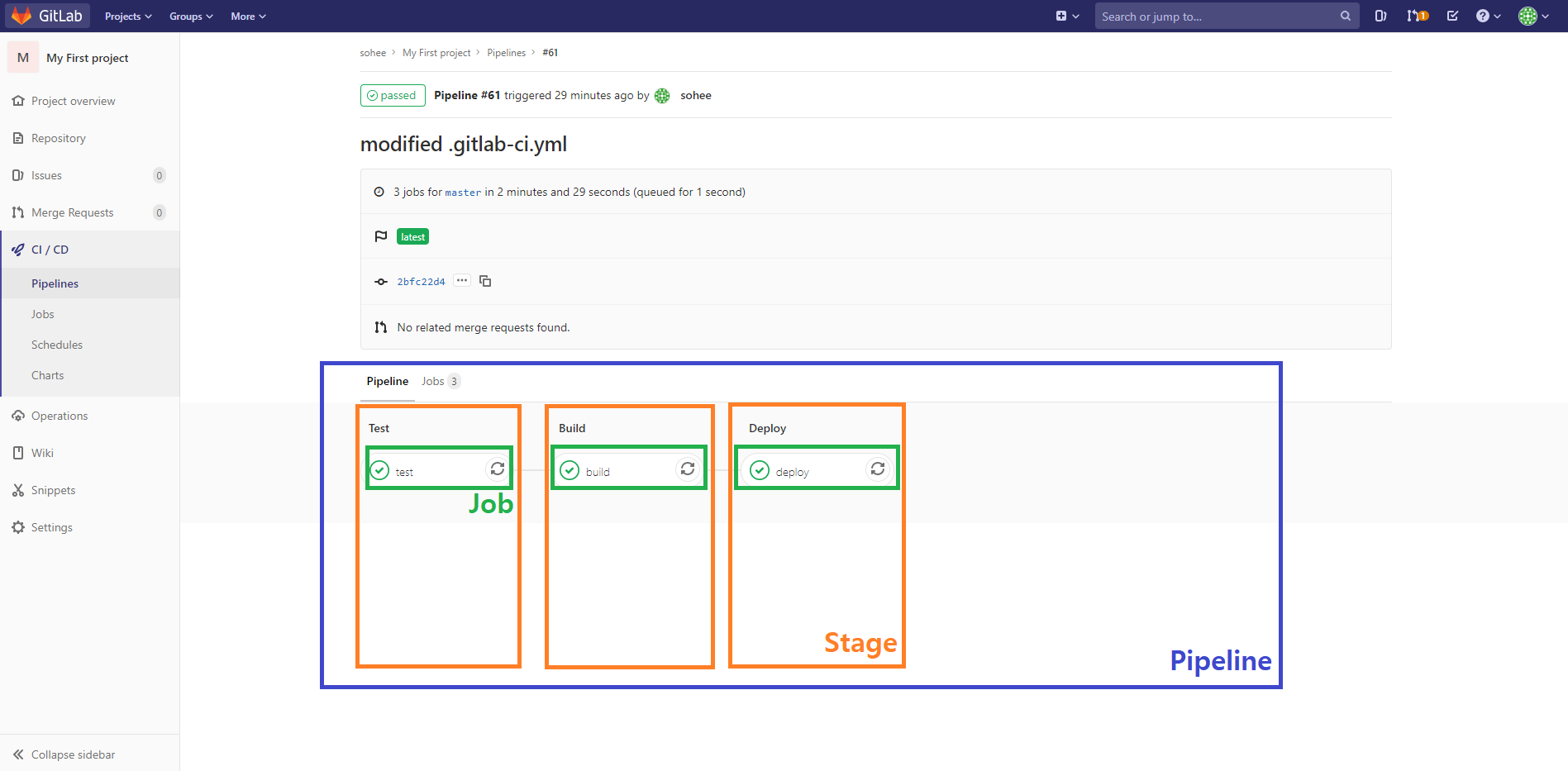 위의 .gitlab-ci.yml 에는 3단계 (테스트, 빌드 및 배포)가 있으며, 각각 특정 단계에 속하는 3가지 작업이 있으며, 현재 해당 작업은 에코를 수행하는 것입니다.