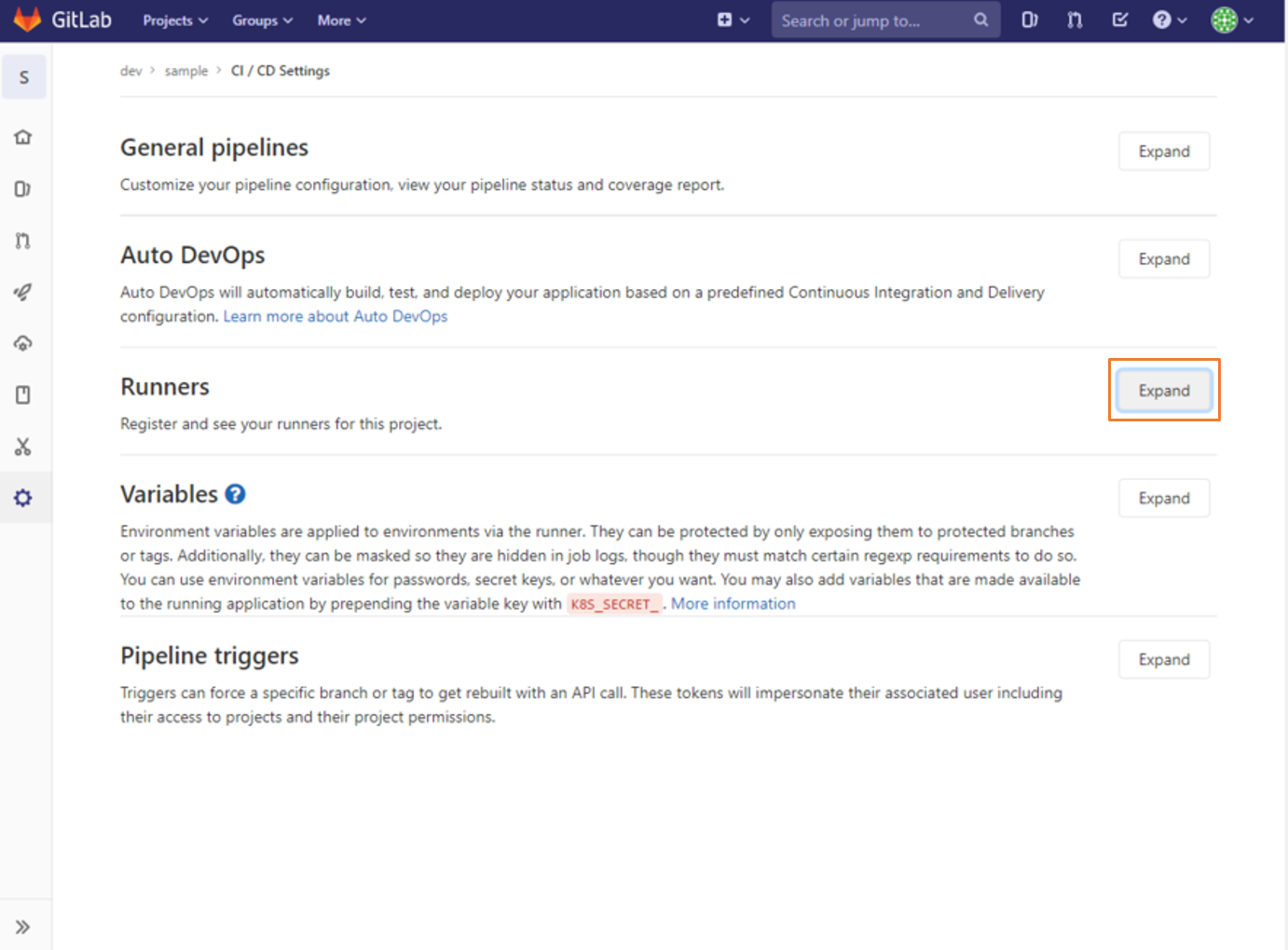 연동할 프로젝트 로 들어가서 좌측 Settings > CI/CD 클릭 합니다.