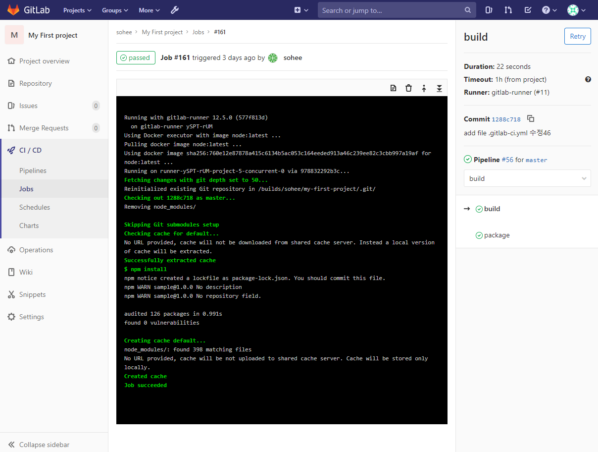 러너와 연결된 프로젝트 화면으로 들어가 사이드 바에 CI/CD > Pipelines 탭을 클릭해줍니다.